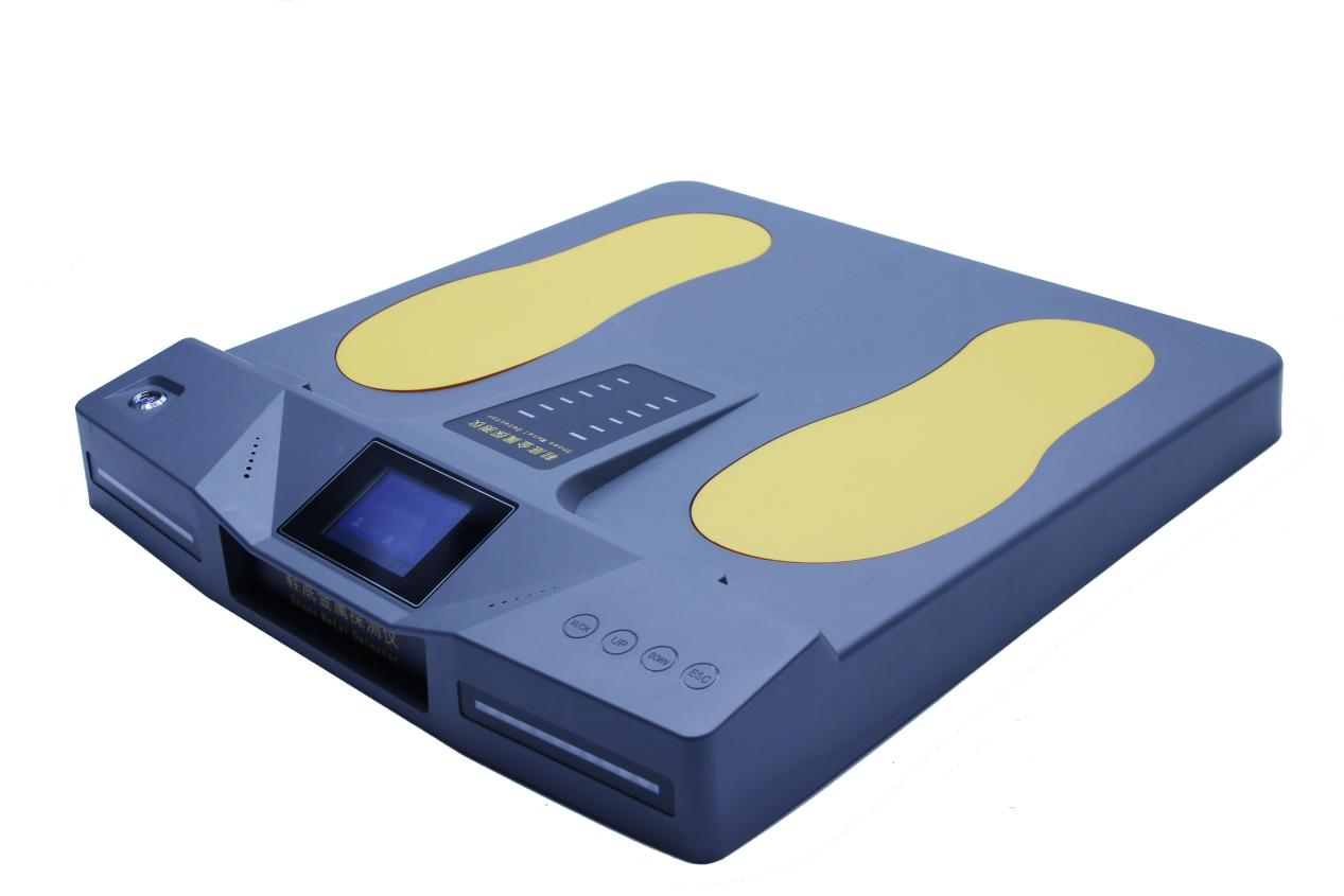 鞋底金属探测仪具有以下优点:金属探测灵敏度较高;抗干扰能力强;两个脚部单独探测区域,每个区域都可以单独设置灵敏度;采用高强度材料,能防火,防腐蚀,防震,防压。全模块化设计,便于快速维护;彩色液晶屏显示器,四键控制,易于操作高灵敏度物质探测率与通过率;